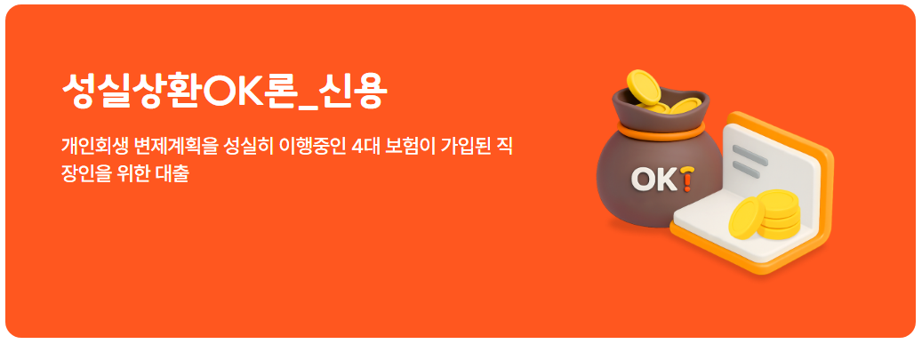 개인회생자 대출가능한곳 성실상환OK론은 개인회생 변제계획을 성실히 이행 중인 직장인을 대상으로 하는 상품으로, 안정적인 소득이 있는 근로자를 위해 설계되었습니다. 이를 통해 개인회생 중에도 필요한 자금을 마련할 수 있으며, 상환 계획에 맞춰 부담 없이 대출을 이용할 수 있습니다.