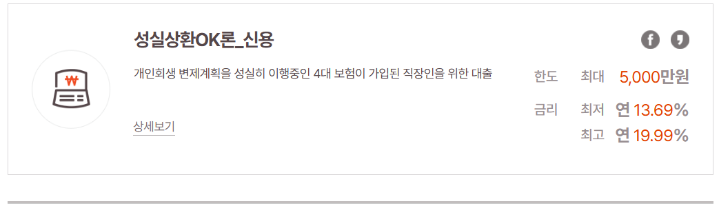 이 상품은 개인회생 인가 후 변제계획을 성실히 이행 중인 직장인을 위한 대출 상품입니다. 4대 보험에 가입된 직장인으로서 변제금 납부 회차가 4회차 이상인 경우 신청이 가능합니다.